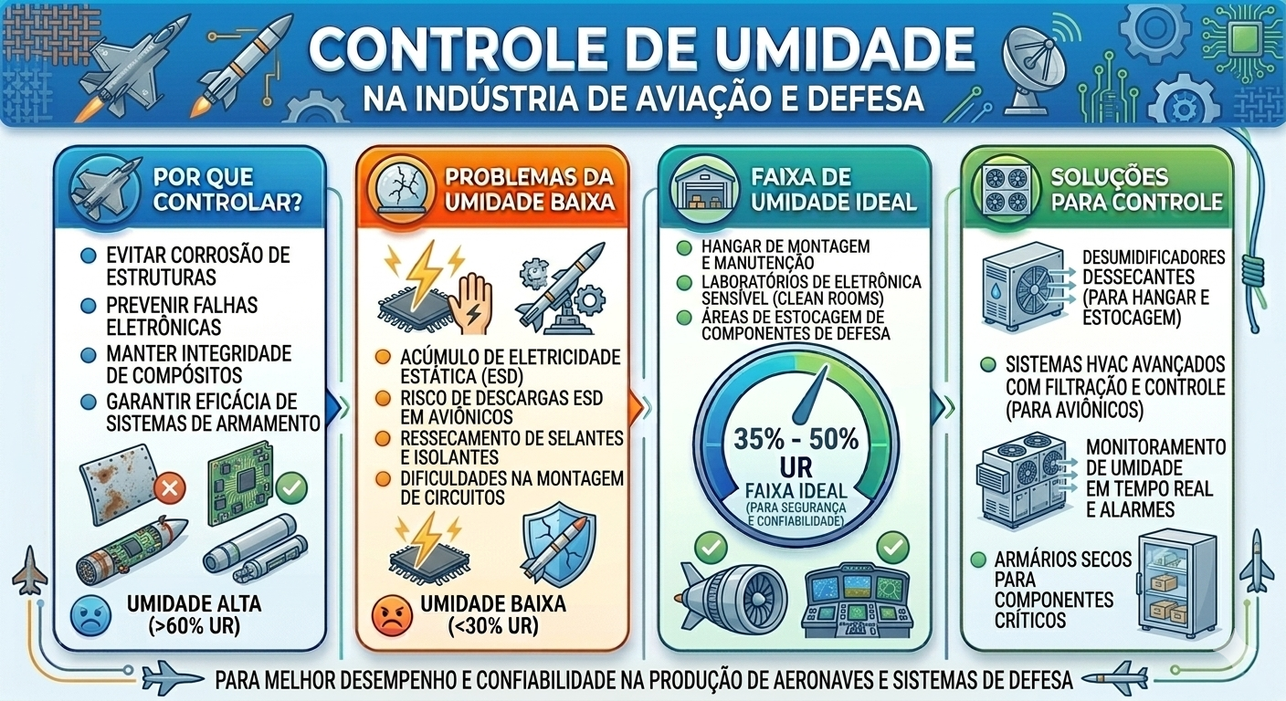 Controle de umidade na indústria de aviação e defesa é o conjunto de tecnologias, processos e práticas ambientais utilizados para manter níveis ideais de umidade em hangares, centros de manutenção, laboratórios aeroespaciais e instalações militares. Esse controle é essencial porque equipamentos aeronáuticos e sistemas de defesa possuem componentes extremamente sensíveis à presença de umidade.