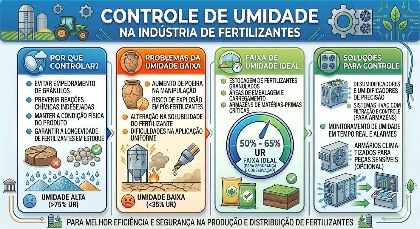 Além disso, o controle de umidade na indústria de fertilizantes também ajuda a evitar reações químicas indesejadas que podem ocorrer quando certos compostos entram em contato com água.